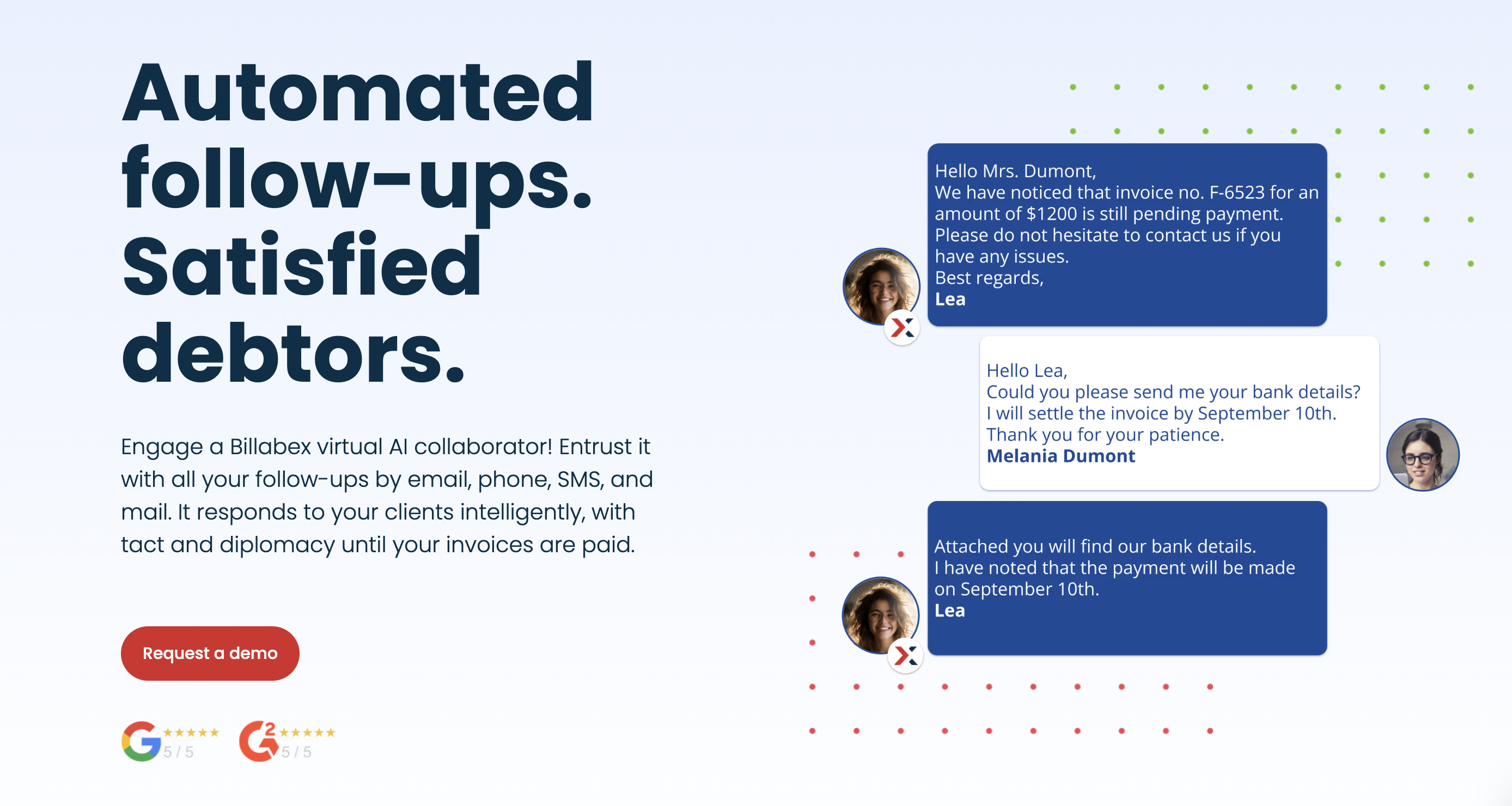 A Billabex oferece um assistente virtual de IA! Confie-lhe todos os seus lembretes por e-mail, telefone, SMS e correio. Ele responde aos seus clientes de forma inteligente, com tato e diplomacia, até que as suas faturas sejam pagas.