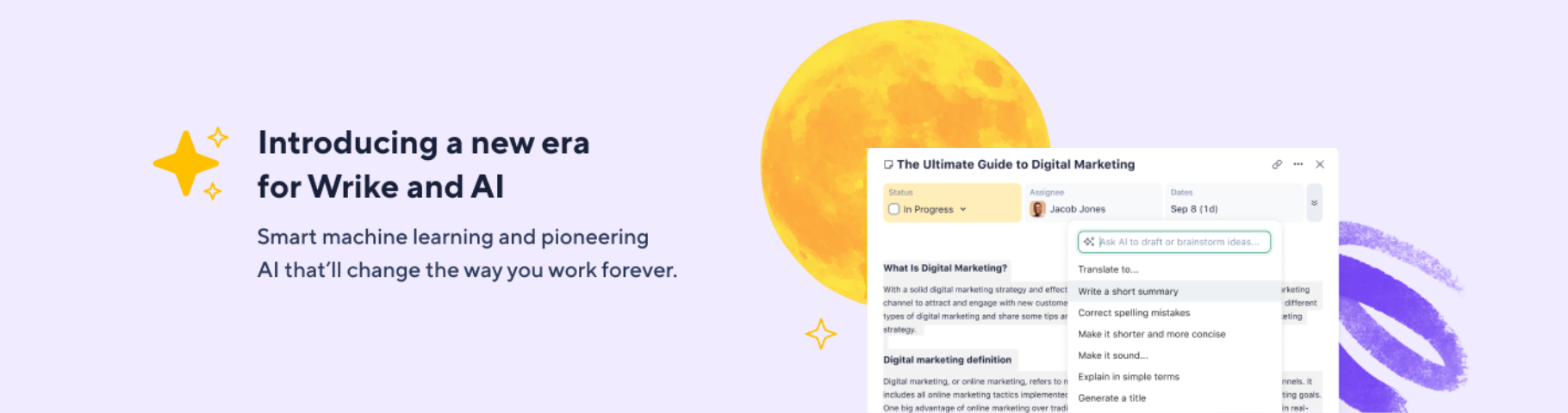 A suíte Work Intelligence do Wrike inclui ferramentas com inteligência artificial para gerenciamento de projetos mais inteligente. Ela ajuda a priorizar tarefas, estimar esforços e detectar riscos com base no comportamento da equipe e em dados históricos. Também automatiza fluxos de trabalho repetitivos por meio do mecanismo de automação do Wrike.
