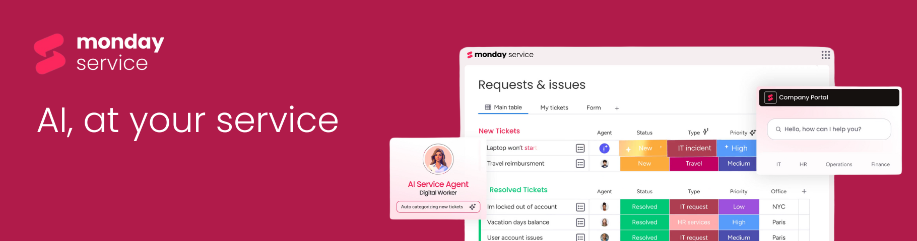 O monday service atende casos de uso em TI, RH, jurídico, operações e atendimento ao cliente, sendo ideal para a gestão de serviços interdepartamentais. Suas ferramentas com inteligência artificial agilizam a categorização e o encaminhamento de tickets, enquanto fluxos de trabalho personalizáveis e portais de autoatendimento ajudam as equipes a escalar o suporte com eficiência. Os principais benefícios incluem tempos de resolução mais rápidos, menos trabalho manual e total visibilidade sobre o desempenho do serviço.
